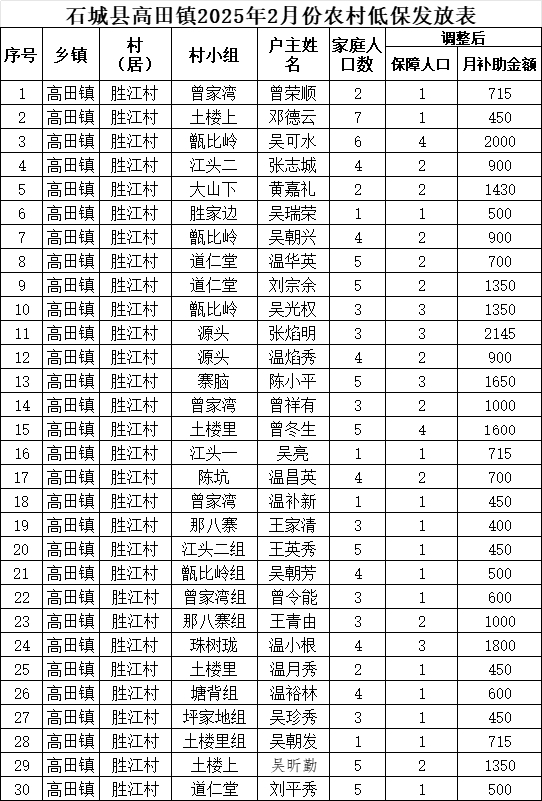 【最低生活保障】石城縣高田鎮(zhèn)勝江村2025年2月份農村低保發(fā)放公示
