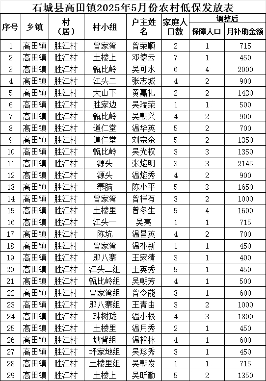 【最低生活保障】石城縣高田鎮(zhèn)勝江村2025年5月份農(nóng)村低保發(fā)放公示