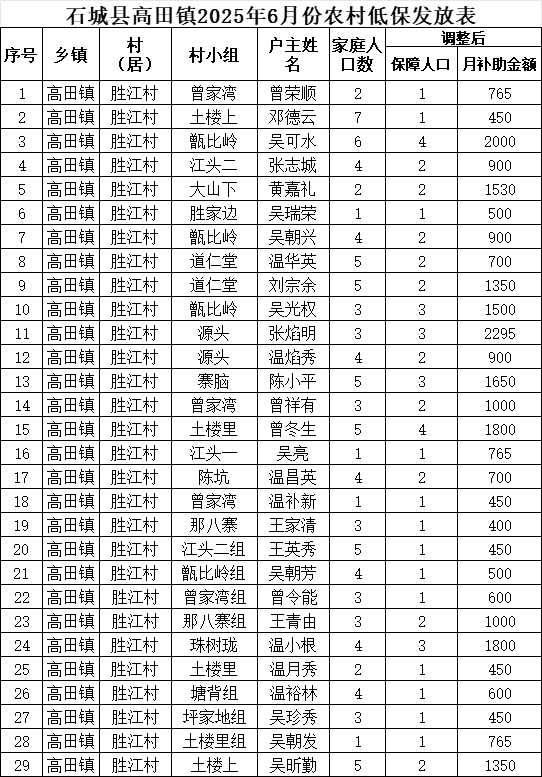 【最低生活保障】石城縣高田鎮(zhèn)勝江村2025年6月份農(nóng)村低保發(fā)放公示