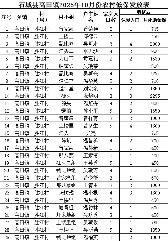 【最低生活保障】石城縣高田鎮(zhèn)勝江村2025年10月份農村低保發(fā)放公示