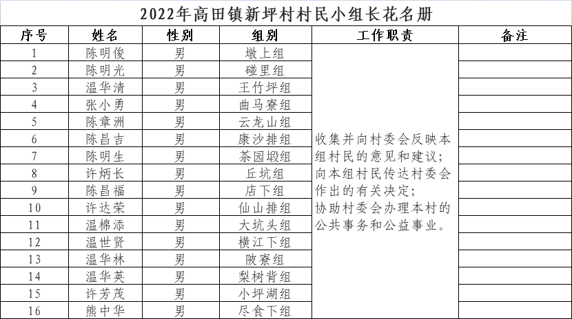 【其他人員信息】2022年高田鎮(zhèn)新坪村村民小組長花名冊