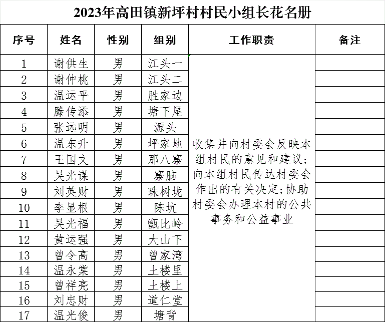 【其他人員信息】2023年高田鎮(zhèn)新坪村村民小組長(zhǎng)花名冊(cè)