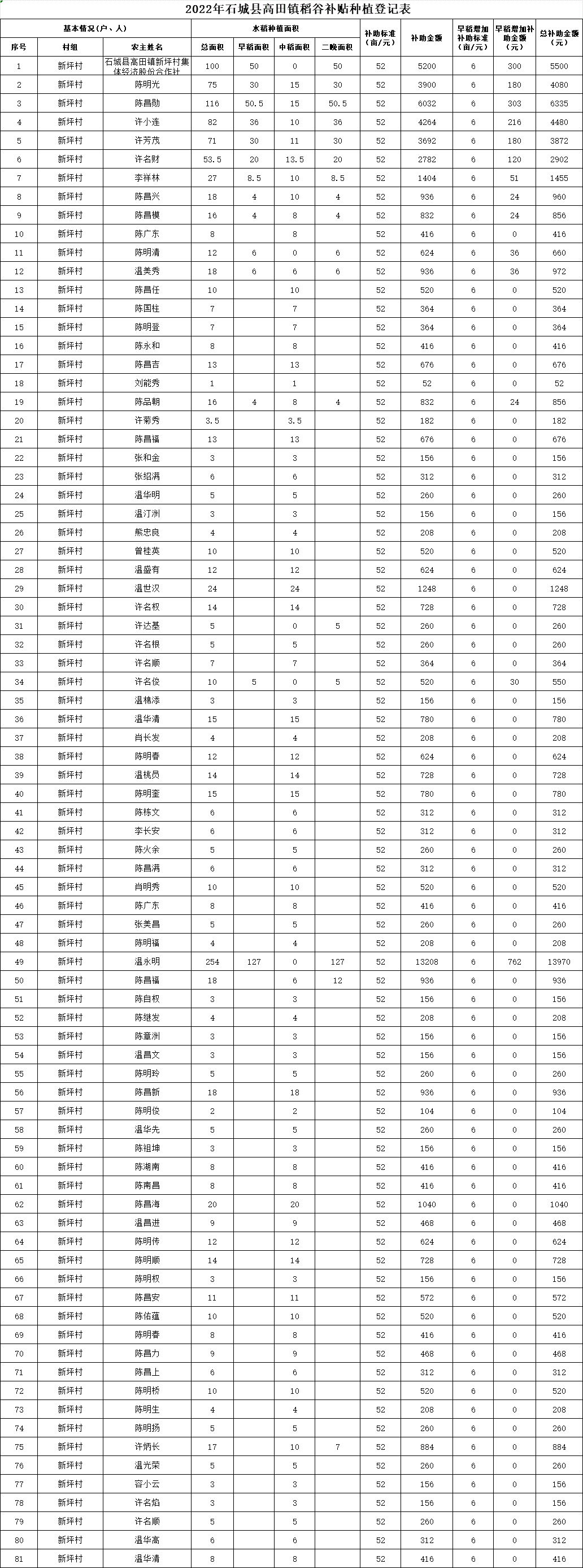 【涉農(nóng)補貼】2022年高田鎮(zhèn)新坪村稻谷補貼種植登記表