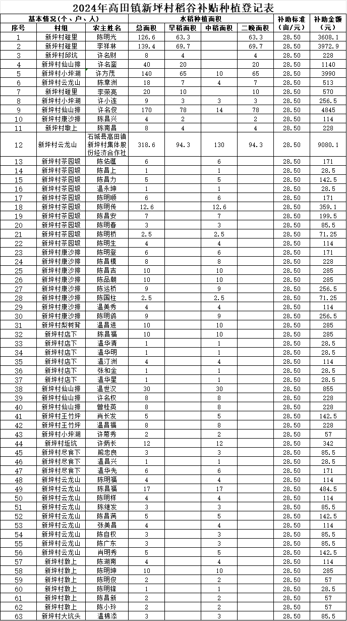 【涉農(nóng)補(bǔ)貼】2024年高田鎮(zhèn)新坪村稻谷補(bǔ)貼種植登記表