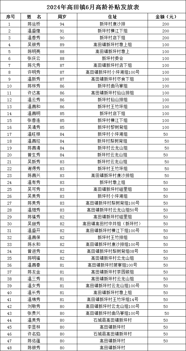 【老年人申領(lǐng)補(bǔ)貼和發(fā)放信息】2024年高田鎮(zhèn)新坪村6月高齡補(bǔ)貼發(fā)放表
