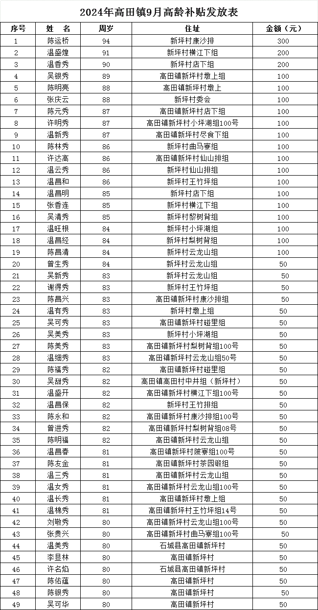 【老年人申領(lǐng)補(bǔ)貼和發(fā)放信息】2024年高田鎮(zhèn)新坪村9月高齡補(bǔ)貼發(fā)放表