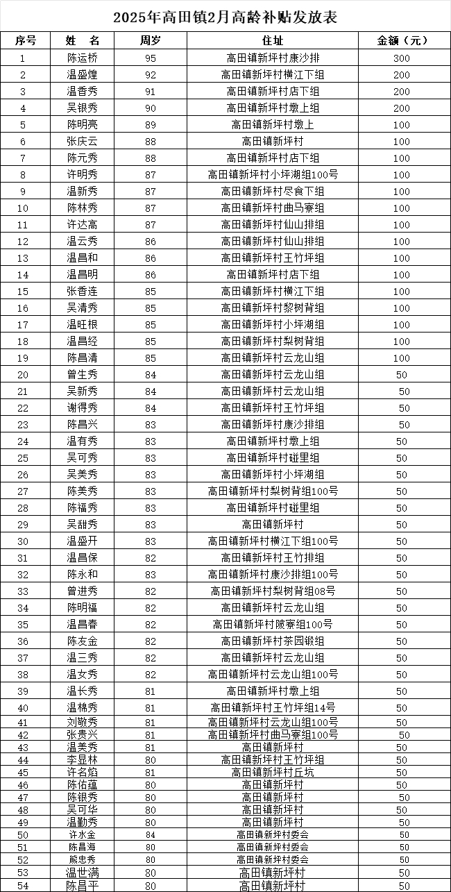 【老年人申領(lǐng)補(bǔ)貼和發(fā)放信息】2025年高田鎮(zhèn)新坪村2月高齡補(bǔ)貼發(fā)放表