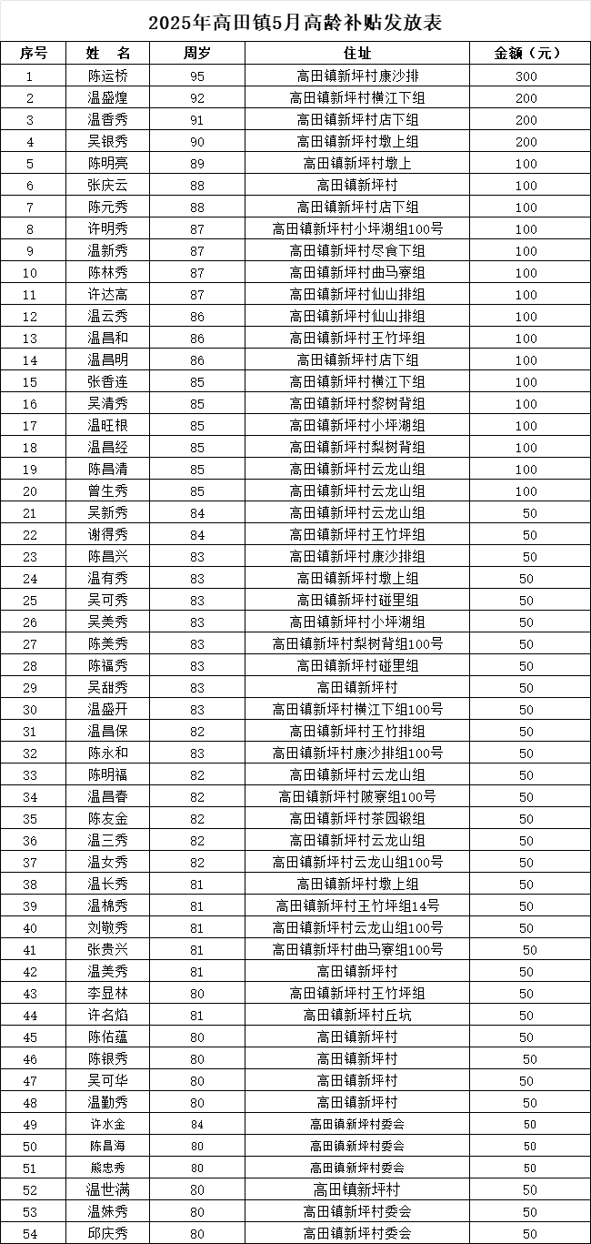 【老年人申領補貼和發(fā)放信息】2025年高田鎮(zhèn)新坪村5月高齡補貼發(fā)放表