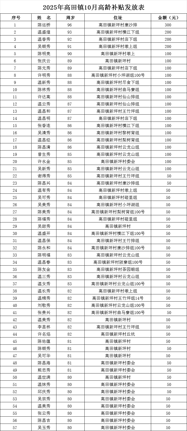 【老年人申領(lǐng)補(bǔ)貼和發(fā)放信息】2025年高田鎮(zhèn)新坪村10月高齡補(bǔ)貼發(fā)放表