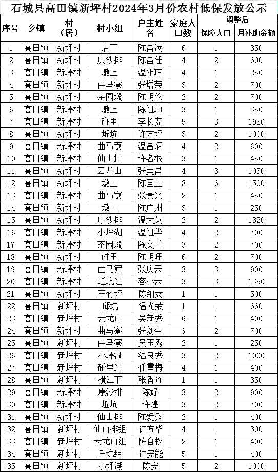 【最低生活保障】石城縣高田鎮(zhèn)新坪村2024年3月份農(nóng)村低保發(fā)放公示