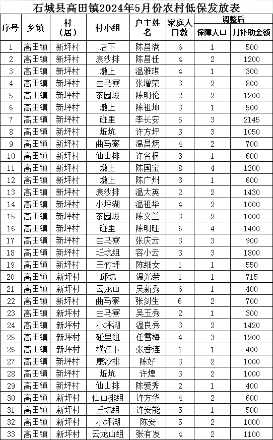 【最低生活保障】石城縣高田鎮(zhèn)新坪村2024年5月份農村低保發(fā)放公示