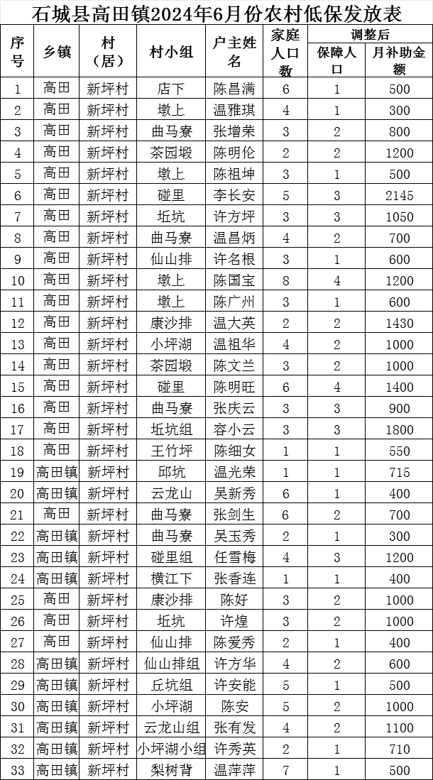 【最低生活保障】石城縣高田鎮(zhèn)新坪村2024年6月份農(nóng)村低保發(fā)放公示