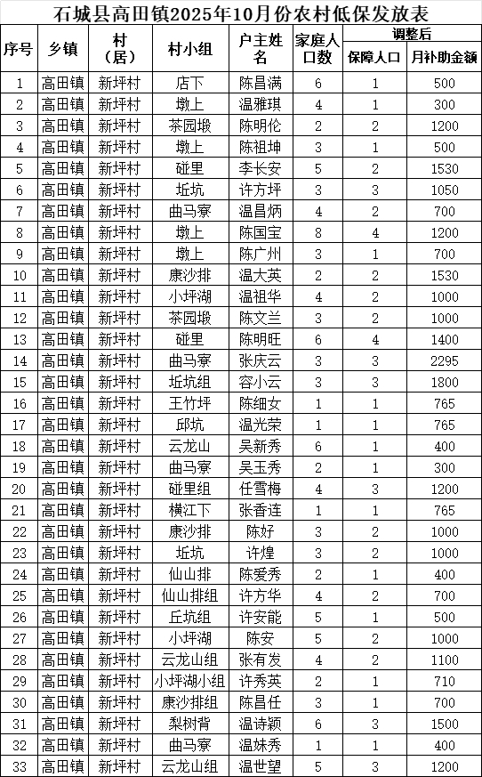【最低生活保障】石城縣高田鎮(zhèn)新坪村2025年10月份農(nóng)村低保發(fā)放公示