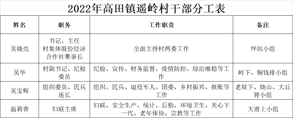【村(居)委會成員信息】2022年高田鎮(zhèn)遙嶺村干部分工表