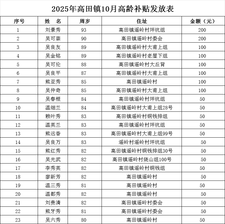 【老年人申領(lǐng)補貼和發(fā)放信息】2025年高田鎮(zhèn)遙嶺村10月高齡補貼發(fā)放表
