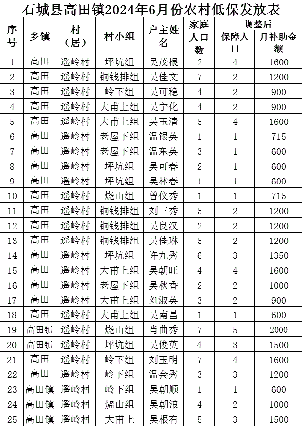 【最低生活保障】石城縣高田鎮(zhèn)遙嶺村2024年6月份農(nóng)村低保發(fā)放公示