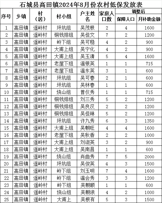【最低生活保障】石城縣高田鎮(zhèn)遙嶺村2024年8月份農(nóng)村低保發(fā)放公示