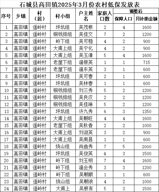 【最低生活保障】石城縣高田鎮(zhèn)遙嶺村2025年3月份農(nóng)村低保發(fā)放公示