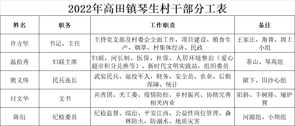 【村(居)委會成員信息】2022年高田鎮(zhèn)琴生村干部分工表
