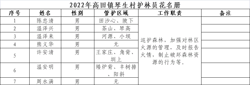 【其他人員信息】2022年高田鎮(zhèn)琴生村護(hù)林員花名冊