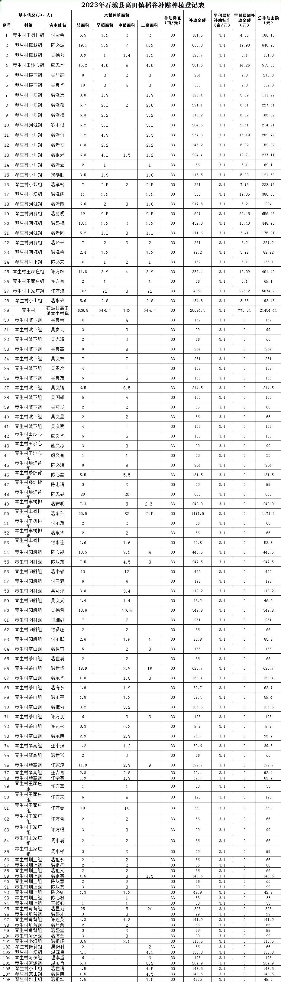【涉農(nóng)補(bǔ)貼】2023年高田鎮(zhèn)琴生村稻谷補(bǔ)貼種植登記表