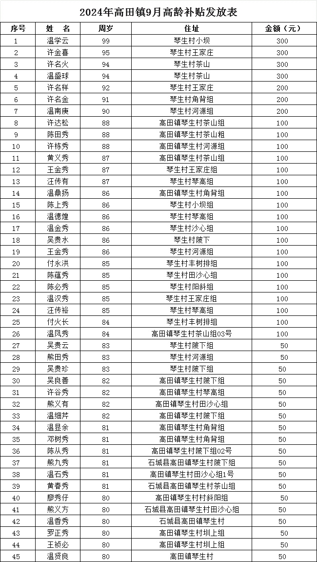 【老年人申領(lǐng)補(bǔ)貼和發(fā)放信息】2024年高田鎮(zhèn)琴生9月高齡補(bǔ)貼發(fā)放表