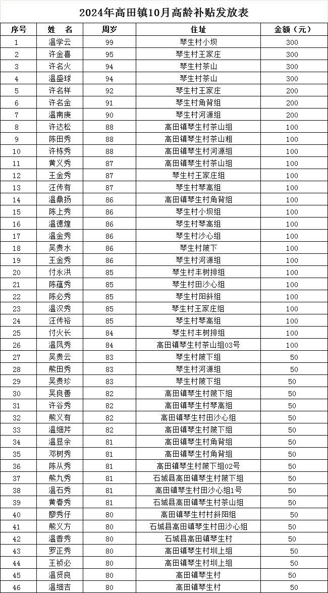 【老年人申領(lǐng)補(bǔ)貼和發(fā)放信息】2024年高田鎮(zhèn)琴生10月高齡補(bǔ)貼發(fā)放表