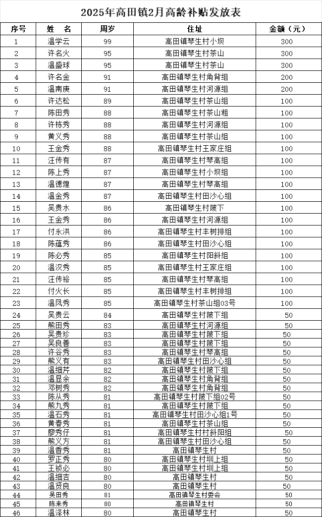 【老年人申領(lǐng)補(bǔ)貼和發(fā)放信息】2025年高田鎮(zhèn)琴生2月高齡補(bǔ)貼發(fā)放表