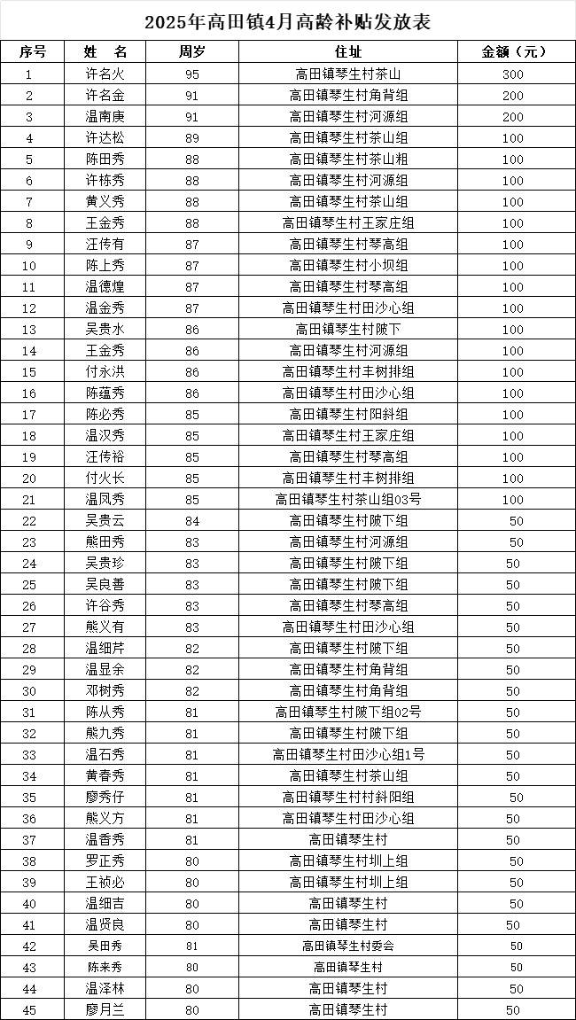 【老年人申領(lǐng)補(bǔ)貼和發(fā)放信息】2025年高田鎮(zhèn)琴生4月高齡補(bǔ)貼發(fā)放表