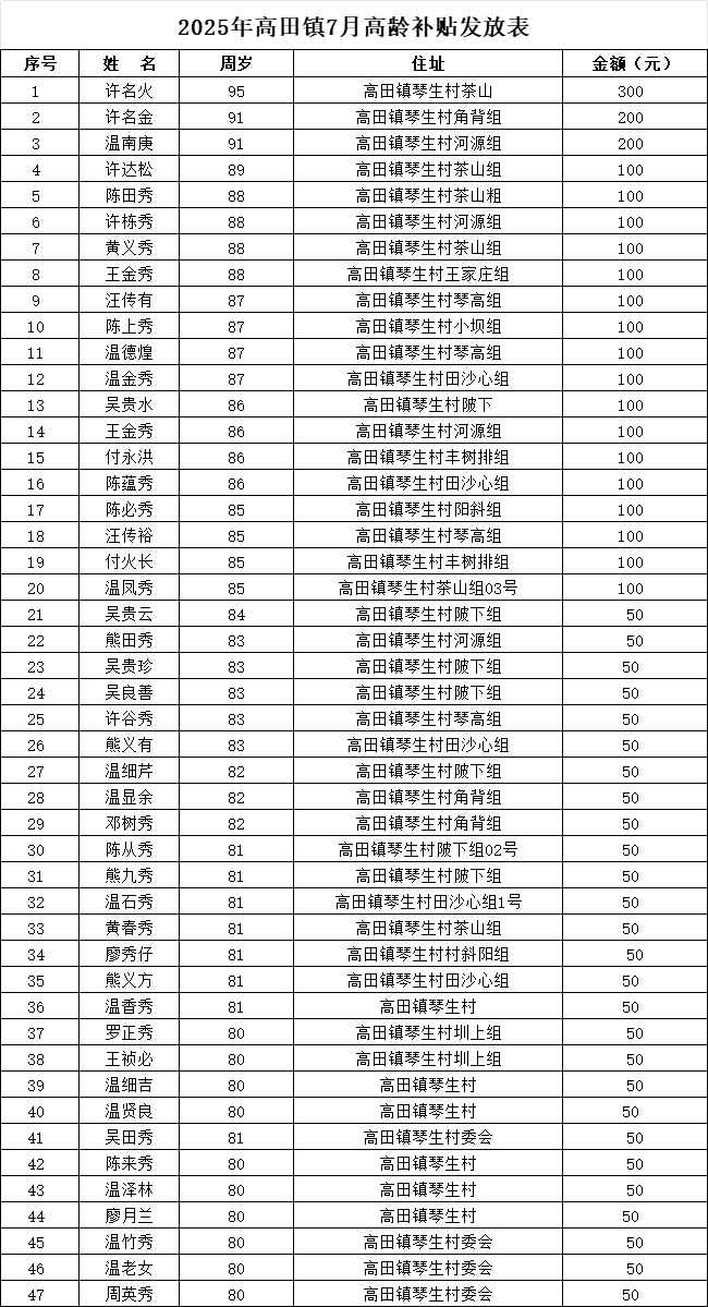 【老年人申領(lǐng)補(bǔ)貼和發(fā)放信息】2025年高田鎮(zhèn)琴生7月高齡補(bǔ)貼發(fā)放表
