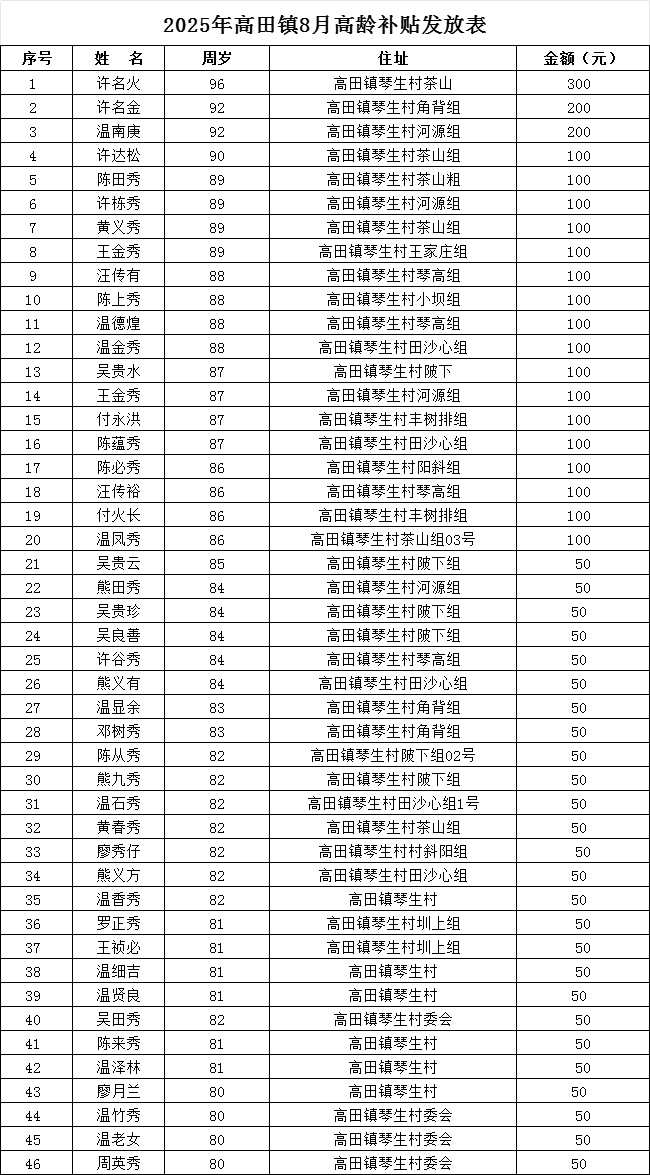 【老年人申領(lǐng)補(bǔ)貼和發(fā)放信息】2025年高田鎮(zhèn)琴生8月高齡補(bǔ)貼發(fā)放表