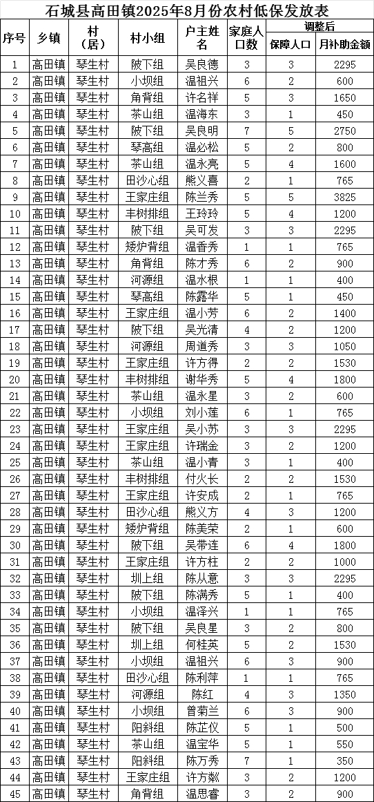 【最低生活保障】石城縣高田鎮(zhèn)琴生村2025年8月份農(nóng)村低保發(fā)放公示