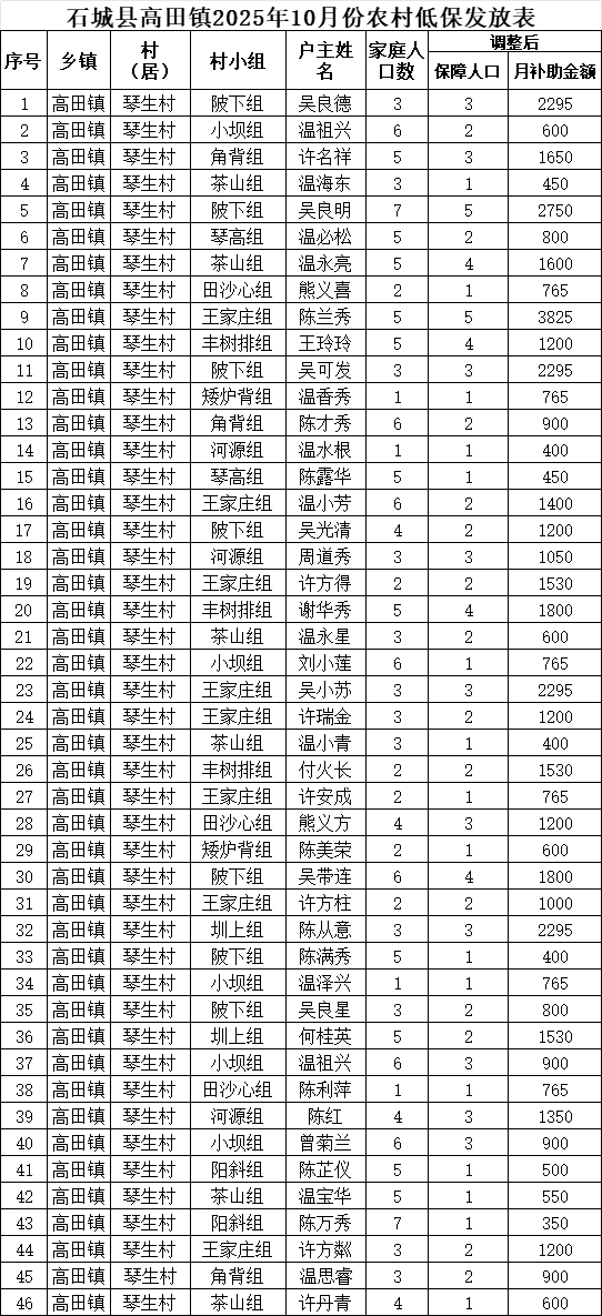 【最低生活保障】石城縣高田鎮(zhèn)琴生村2025年10月份農(nóng)村低保發(fā)放公示
