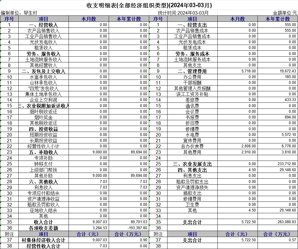 【村(社區(qū))財務收支狀況】高田鎮(zhèn)琴生村2024年3月份財務收支狀況明細賬