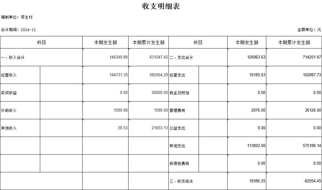 【村(社區(qū))財(cái)務(wù)收支狀況】高田鎮(zhèn)琴生村2024年12月份財(cái)務(wù)收支狀況明細(xì)賬