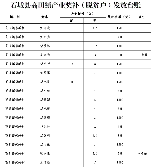 【產(chǎn)業(yè)扶持】高田鎮(zhèn)巖嶺村產(chǎn)業(yè)獎(jiǎng)補(bǔ)(脫貧戶)發(fā)放臺(tái)賬(2022年度第一批)