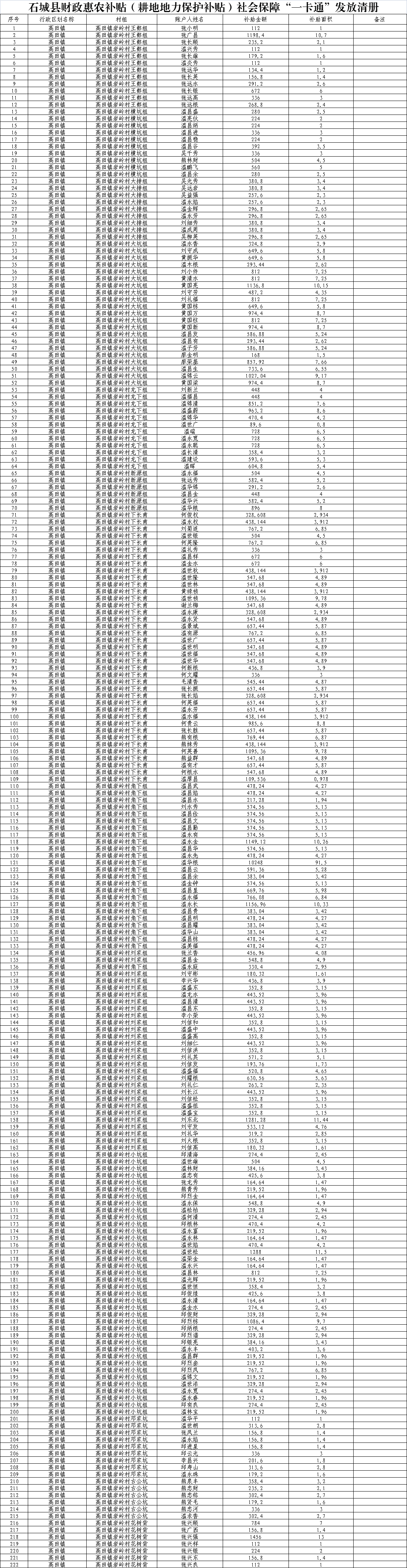 【涉農(nóng)補貼】2022年高田鎮(zhèn)巖嶺村財政惠農(nóng)補貼(耕地地力保護補貼)社會保障“一卡通”發(fā)放清冊