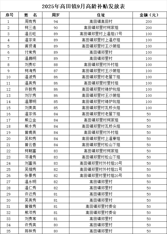 【老年人申領(lǐng)補貼和發(fā)放信息】2025年高田鎮(zhèn)鄭里村9月高齡補貼發(fā)放表