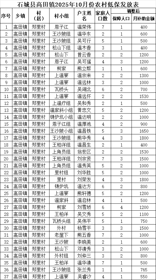 【最低生活保障】石城縣高田鎮(zhèn)鄭里村2025年10月份農(nóng)村低保發(fā)放公示
