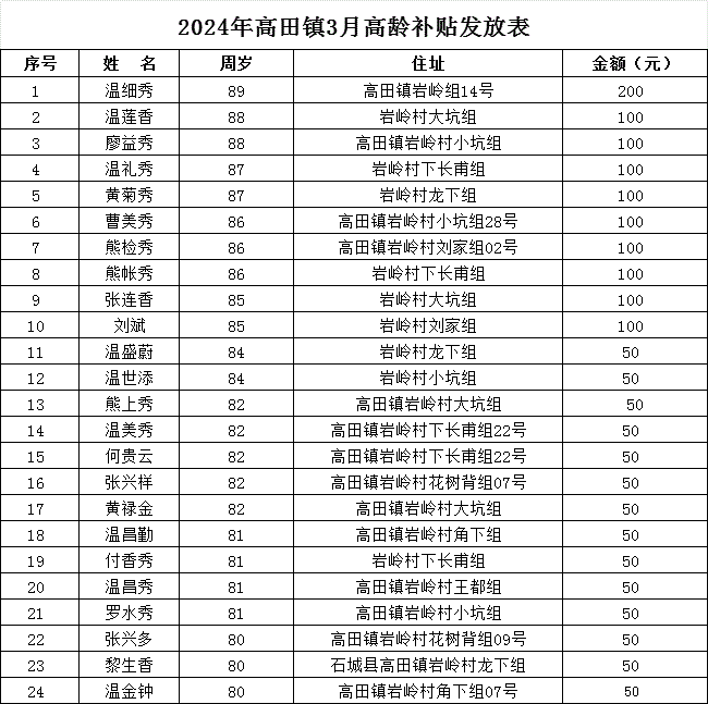 【老年人申領(lǐng)補(bǔ)貼和發(fā)放信息】2024年高田鎮(zhèn)巖嶺村3月高齡補(bǔ)貼發(fā)放表