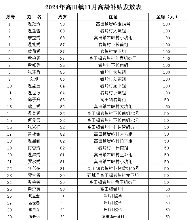 【老年人申領補貼和發(fā)放信息】2024年高田鎮(zhèn)巖嶺村11月高齡補貼發(fā)放表
