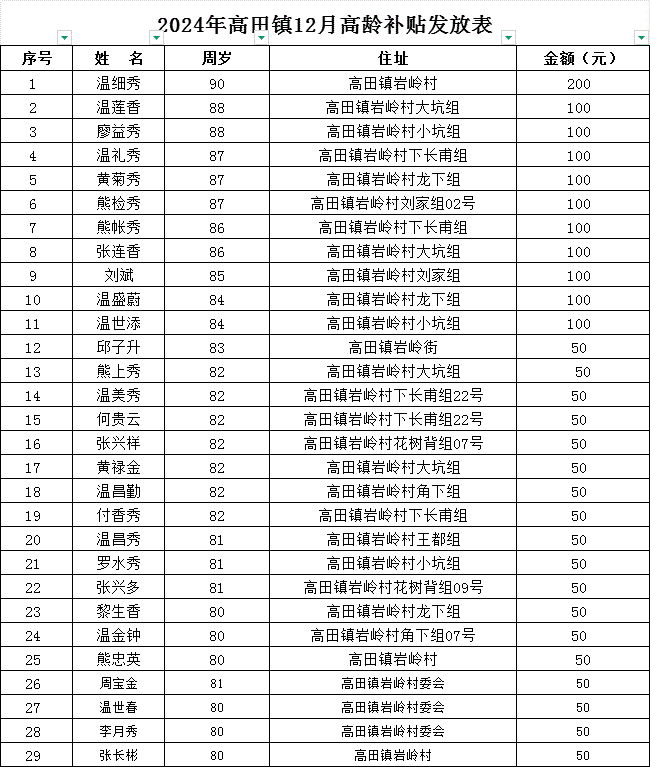 【老年人申領(lǐng)補(bǔ)貼和發(fā)放信息】2024年高田鎮(zhèn)巖嶺村12月高齡補(bǔ)貼發(fā)放表