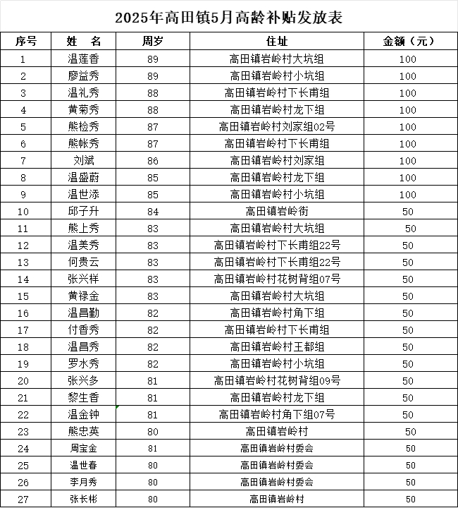 【老年人申領(lǐng)補(bǔ)貼和發(fā)放信息】2025年高田鎮(zhèn)巖嶺村5月高齡補(bǔ)貼發(fā)放表