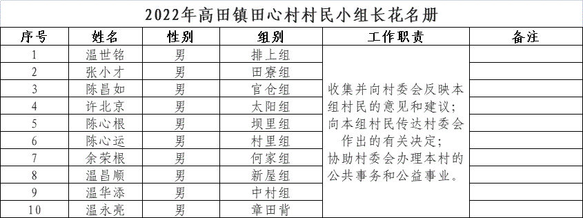 【其他人員信息】2022年高田鎮(zhèn)田心村村民小組長花名冊