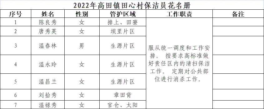 【其他人員信息】2022年高田鎮(zhèn)田心村保潔員花名冊(cè)