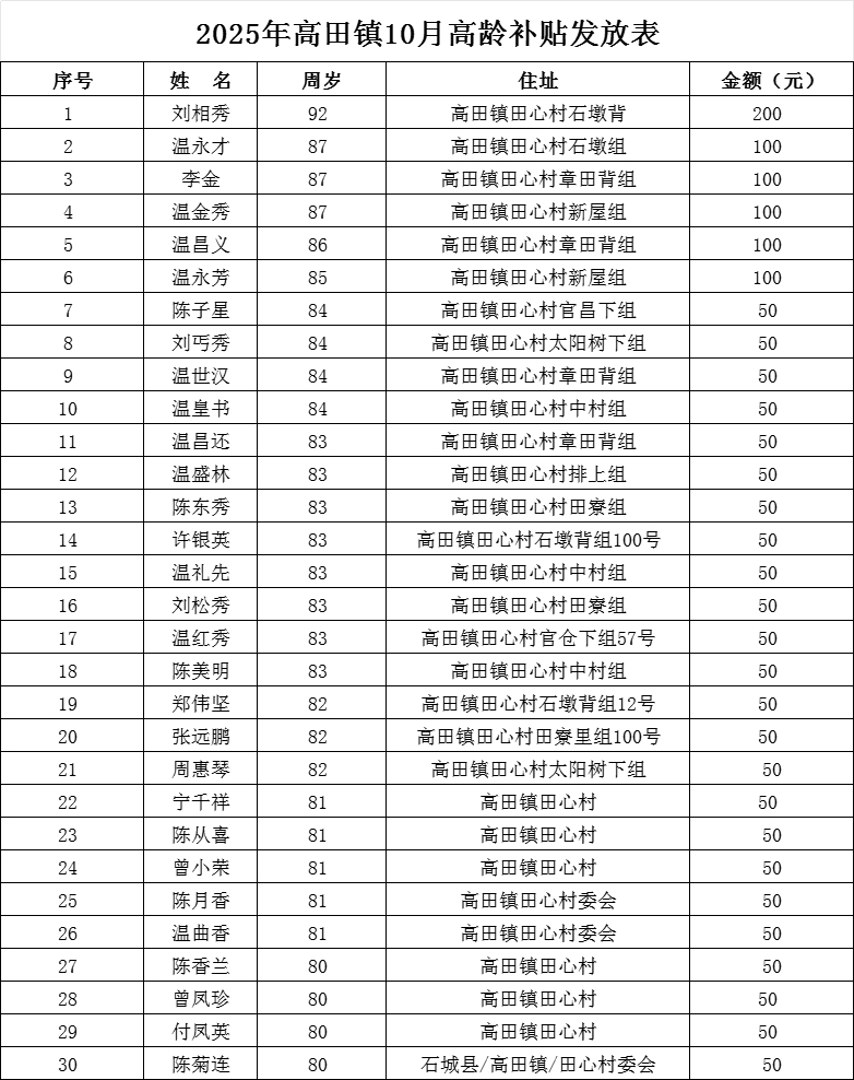 【老年人申領(lǐng)補(bǔ)貼和發(fā)放信息】2025年高田鎮(zhèn)田心村10月高齡補(bǔ)貼發(fā)放表