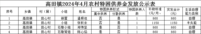 【特困人員救助供養(yǎng)】高田鎮(zhèn)田心村2024年4月農(nóng)村特困供養(yǎng)金發(fā)放公示表