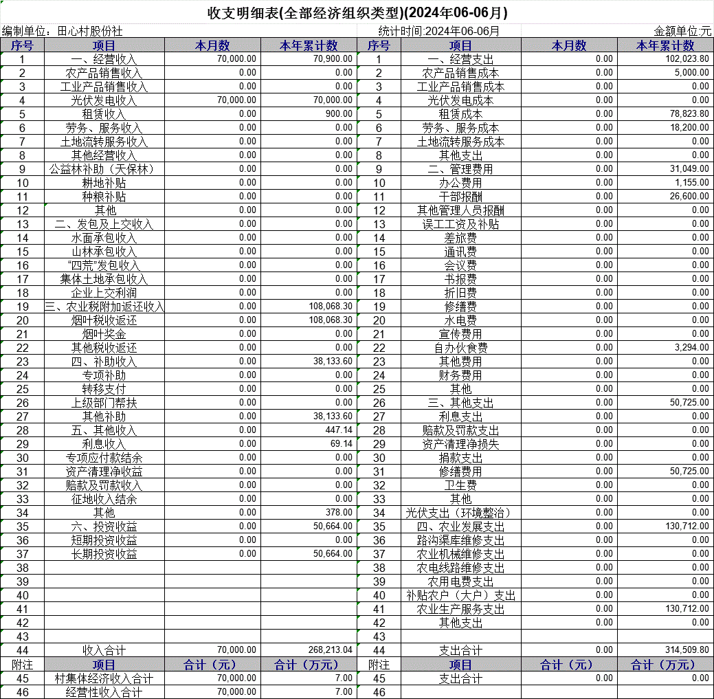 【村(社區(qū))財務收支狀況】高田鎮(zhèn)田心村2024年6月份財務收支狀況明細賬