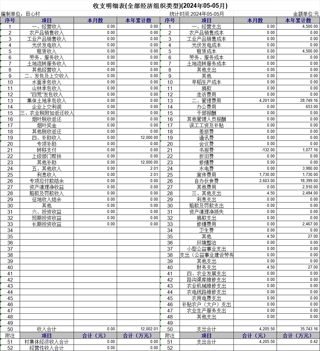 【村(社區(qū))財務(wù)收支狀況】高田鎮(zhèn)田心村2024年5月份財務(wù)收支狀況明細賬
