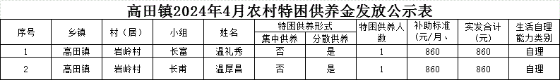 【特困人員救助供養(yǎng)】高田鎮(zhèn)巖嶺村2024年4月農(nóng)村特困供養(yǎng)金發(fā)放臺(tái)賬